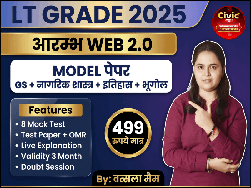 📘 LT Grade Exam – 8 Mock Test (GS + नागरिकशास्त्र + इतिहास + भूगोल) LT Grade परीक्षा में सलेक्शन सिर्फ पढ़ाई से नहीं, सही तरह की practice से होता है । इसी लिए आपके लिए लाई गई है 8 Mock Tests की खास सीरीज़, जो पूरी तरह असली परीक्षा के पैटर्न पर आधारित है । ✨ Mock Test की खास बातें ✅ OMR आधारित टेस्ट – ताकि आपको बिल्कुल Real Exam जैसा अनुभव मिले ✅ GS, History, Civics और Geography से संतुलित और exam‑oriented प्रश्न शामिल किए गए हैं ✅ Live Explanation – हर टेस्ट के बाद, जिसमें हर प्रश्न को आसान भाषा में समझाया जाएगा ✅ Doubt Session – ताकि आपकी कोई भी शंका अधूरी न रहे ✅ Exam Oriented Questions – नए pattern और अपडेटेड trend को ध्यान में रखते हुए तैयार किए गए ✅ Performance Analysis – जिससे आप अपनी तैयारी का सही आकलन कर सकें 🎯 यह Mock Test क्यों ज़रूरी है? ⏰ समय प्रबंधन की प्रैक्टिस – Time bound paper देकर आप अपना time management मजबूत कर पाएंगे 🎯 कमजोर टॉपिक्स की पहचान – Result और analysis से आपके weak topics तुरंत सामने आ जाएंगे 💡 Concept Clear करने का मौका – बार‑बार explanation से concepts और भी clear हो जाएंगे 🚀 आत्मविश्वास में बढ़ोतरी – Real exam जैसा माहौल मिलने से डर कम होगा और confidence अपने आप बढ़ेगा 📌 जो भी छात्र LT Grade परीक्षा को गंभीरता से तैयारी कर रहे हैं, उनके लिए यह Mock Test Series preparation को अगले level पर ले जाने का बेहतरीन मौका है!